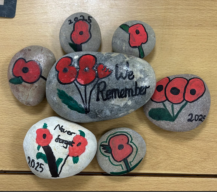 On 11th November, Year 6 led an assembly to help us more about Remembrance Day. They shared why it was important to remember, poppies, a song and recited On Flanders Field. After the assembly, Mr Dourado, Mrs O’Mahony and some Forces children went to the war memorial at the bottom of School Lane to lay a wreath and some stones that they painted.